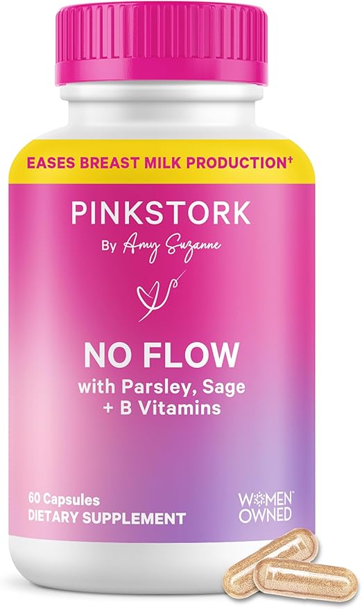 Pink Stork No Flow capsules are expertly formulated to provide relief from lactation quickly and efficiently. The blend of Sage, Parsley, Chinese Mint, and Licorice synergizes to inhibit milk production while supporting postpartum recovery. Each bottle ensures a seamless experience with 60 capsules designed to last a month.